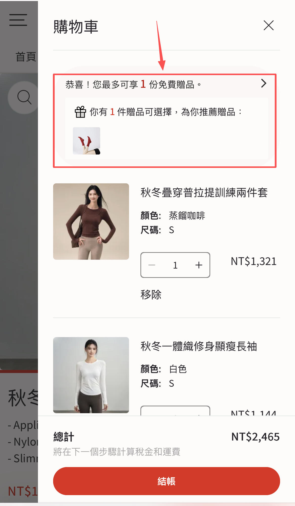購物車頁選取:加購2件或以上商品後進入購物車頁面再選擇贈品