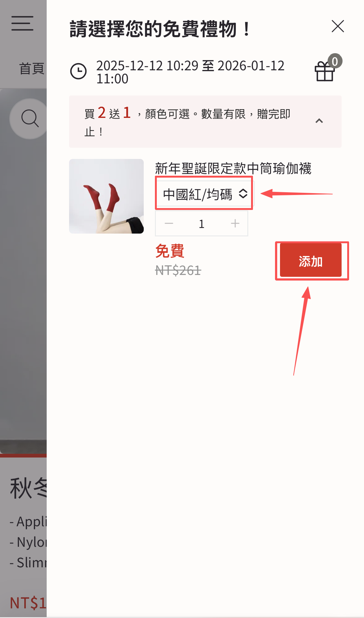 選擇贈品顏色後,一定要點擊「添加」