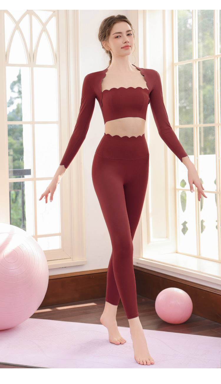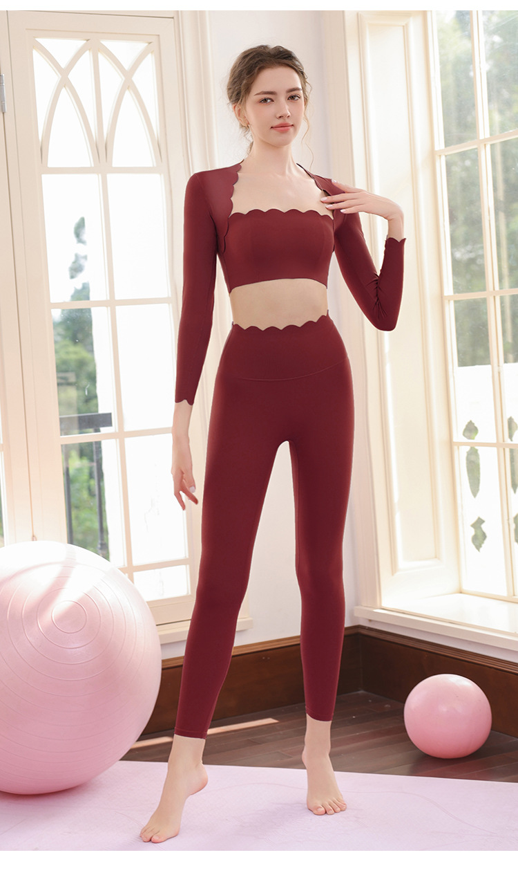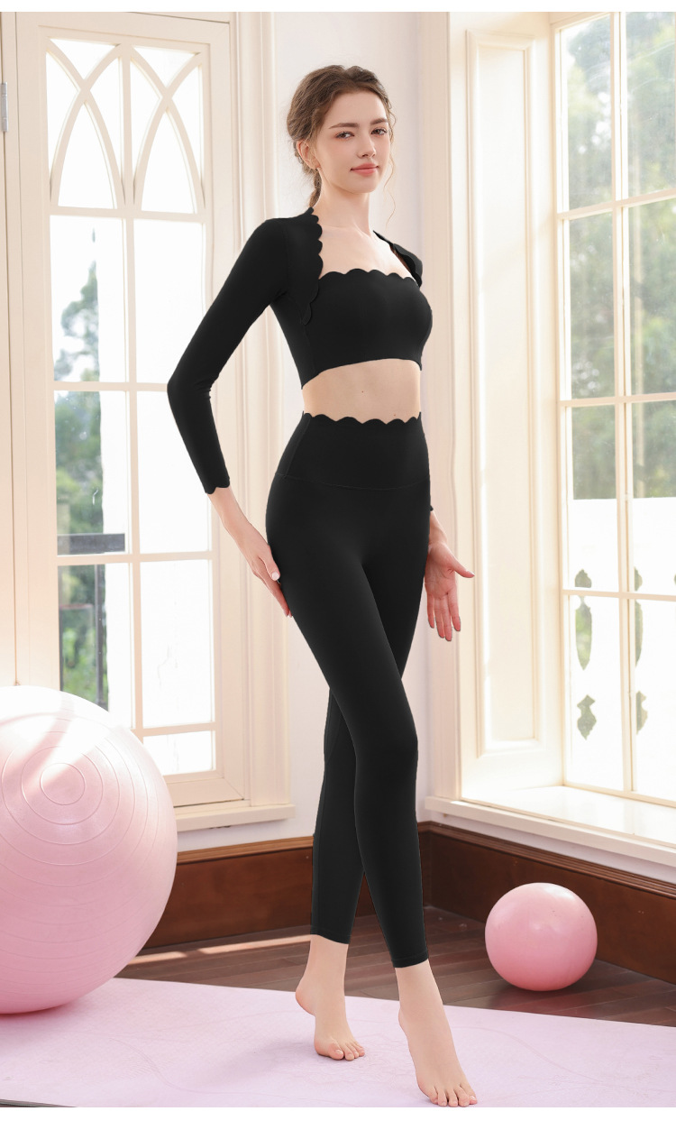 波浪花邊長袖上衣高腰提臀緊身褲套裝